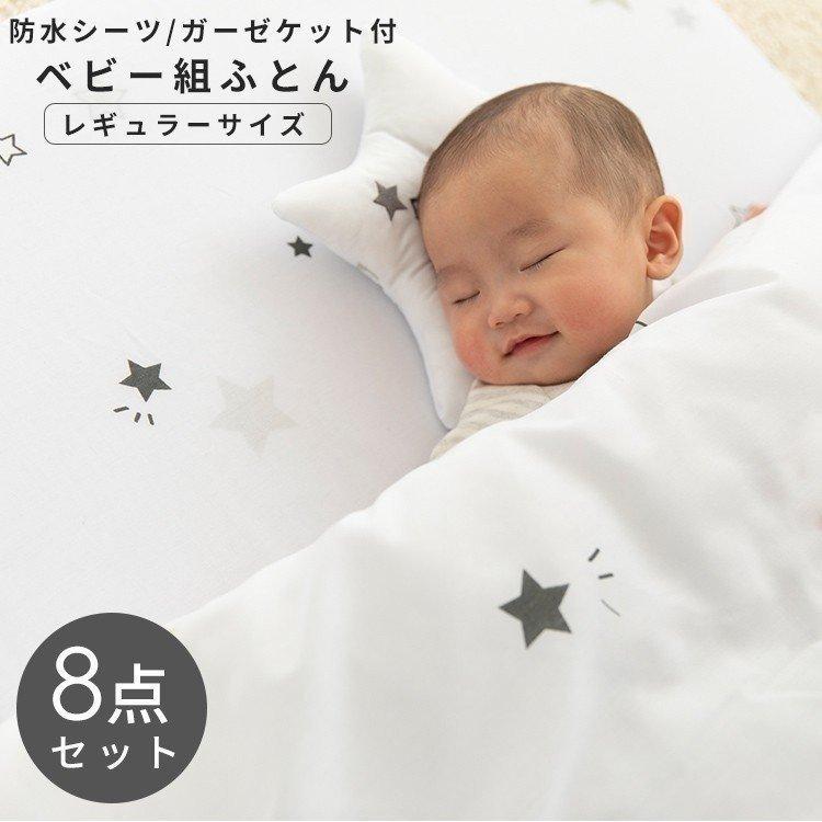 ベビー布団セット レギュラー 普通サイズ 充実10点セット モノトーン スター柄 授乳クッション付き 羽毛布団通販 こだわり安眠館 本店